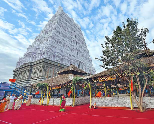 During the year 2010 the Rajagopuram has started developing cracks and signs of deterioration was visible on the structure. The expert’s committee has critically examined and have ruled out it’s structural stability and recommended for dismantle and re-built. CVR Foundation has come forward to take up the responsibility of re-building dismantled Rajagopuram structure to a height of 144 ft. as a service to the temple. The CVR Foundation has taken up the Design & Re-construction right from relaying of foundations to construction of Gopuram in close consultation with Agama Shastra and Engineering experts.