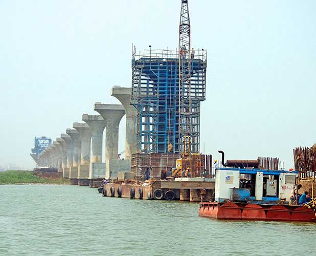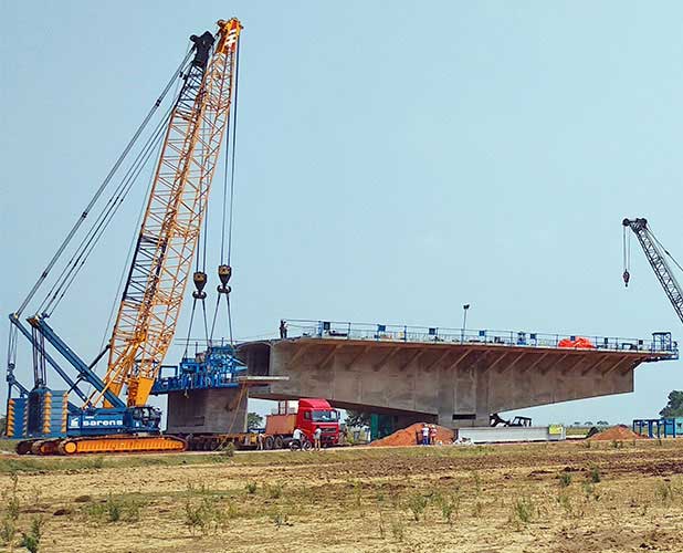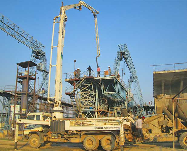 The four lane bridge will have 45 spans each of length 125 m, one of the longest spans for a bridge in India. The segmental erection is done using the balanced cantilever erection method with a 200 mt capacity launching gantry of length 278 m.