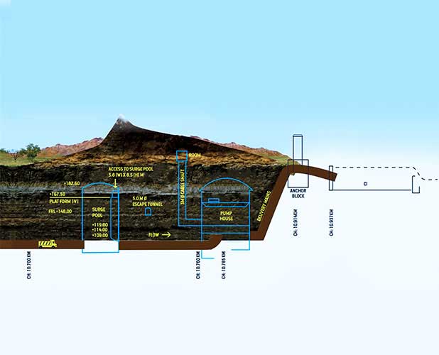 The project consists of twin tunnels, each 9.534 kms in length and 10 m dia, to bring the water into the surge pool. This surge pool, designed to withstand a sudden rise in water if ever the pumps trip, is the largest man-made cavern in India (375 m x 25 m x 67 m). The water from the surge pool is fed into each of the pumps through 7 draft tubes, each with a 5.8 m dia.
